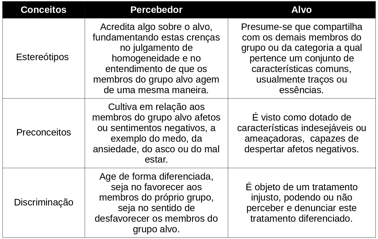 Partiremos de duas ideias centrais nessa concepção, as de rigidez e as de repetição, adotando-as com a finalidade de indicar os dois polos a serem considerados em qualquer definição abrangente dos estereótipos: a diferenciação entre as perspectivas do percebedor, aquele que aplica os estereótipos durante o julgamento social e, a do alvo, o objeto do julgamento estereotipado.